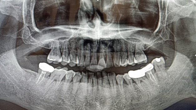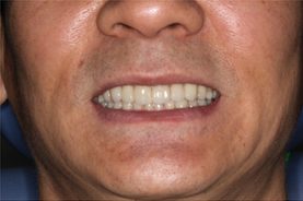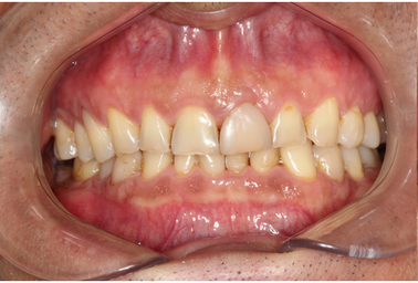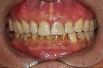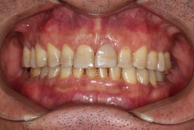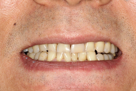 Mr NK, a 52-year-old male, presented with concerns of gradually shortening teeth and sensitivity to cold drinks. He also reported feeling self-conscious about his smile in photos. He is medically fit and has been using a night guard for his sleep-related grinding habit for the past year. Clinical examination revealed moderately worn dentition from erosion and attrition, along with mild crowding of the lower anterior incisors.